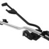 Thule ProRide 598 carries the complete bike without the need to remove the front wheel. Light and elegant aluminium design. The adjustable jaws hold the bike securely in place comfortably tightened at car roof height by turning one screw knob.